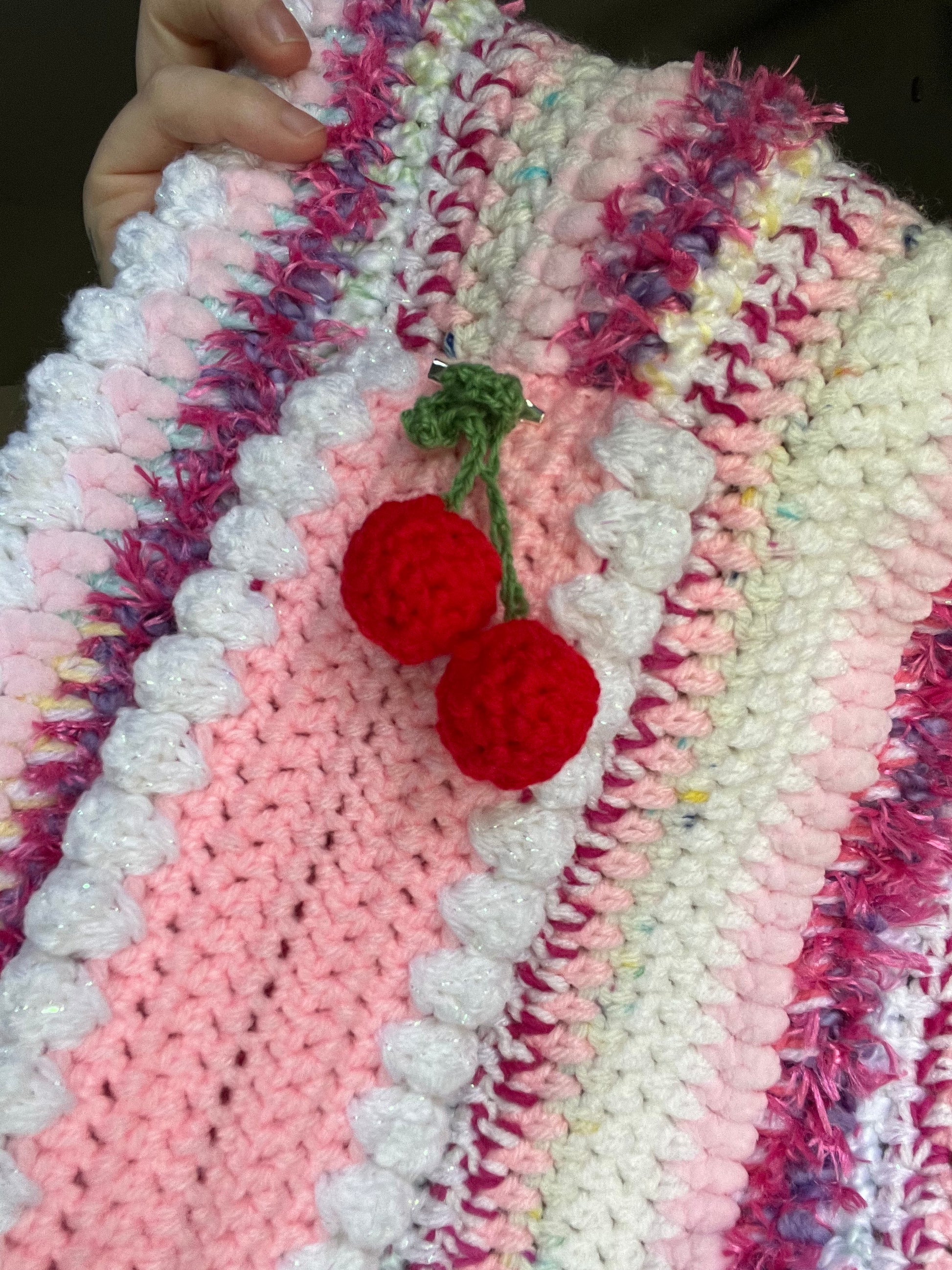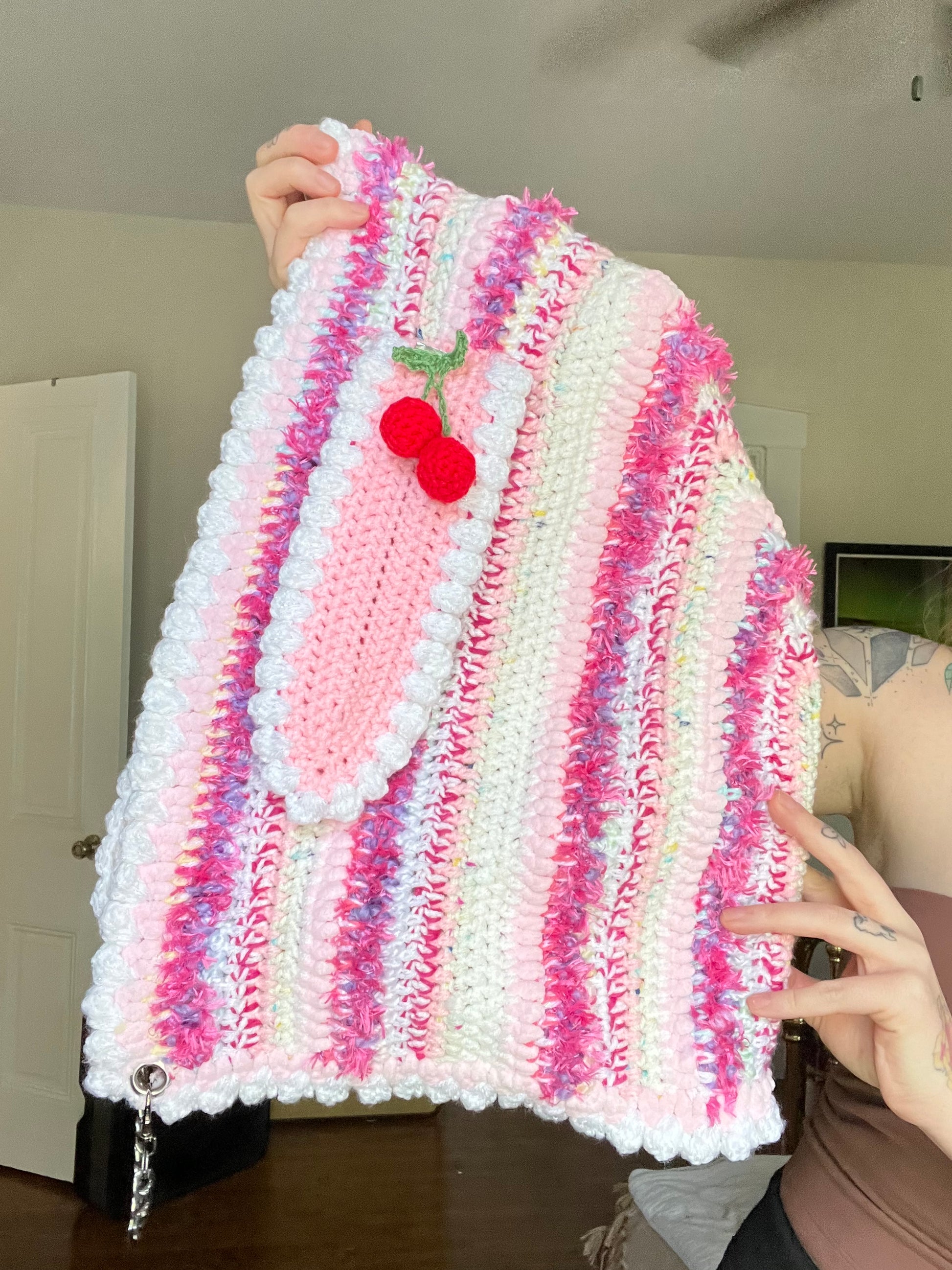 Adorable bunny cake hood made with pink, white and purple yarns! Piping around the hood and ears is crocheted with sparkling white yarn and the hidden pocket ears are adorned with removable cherries!