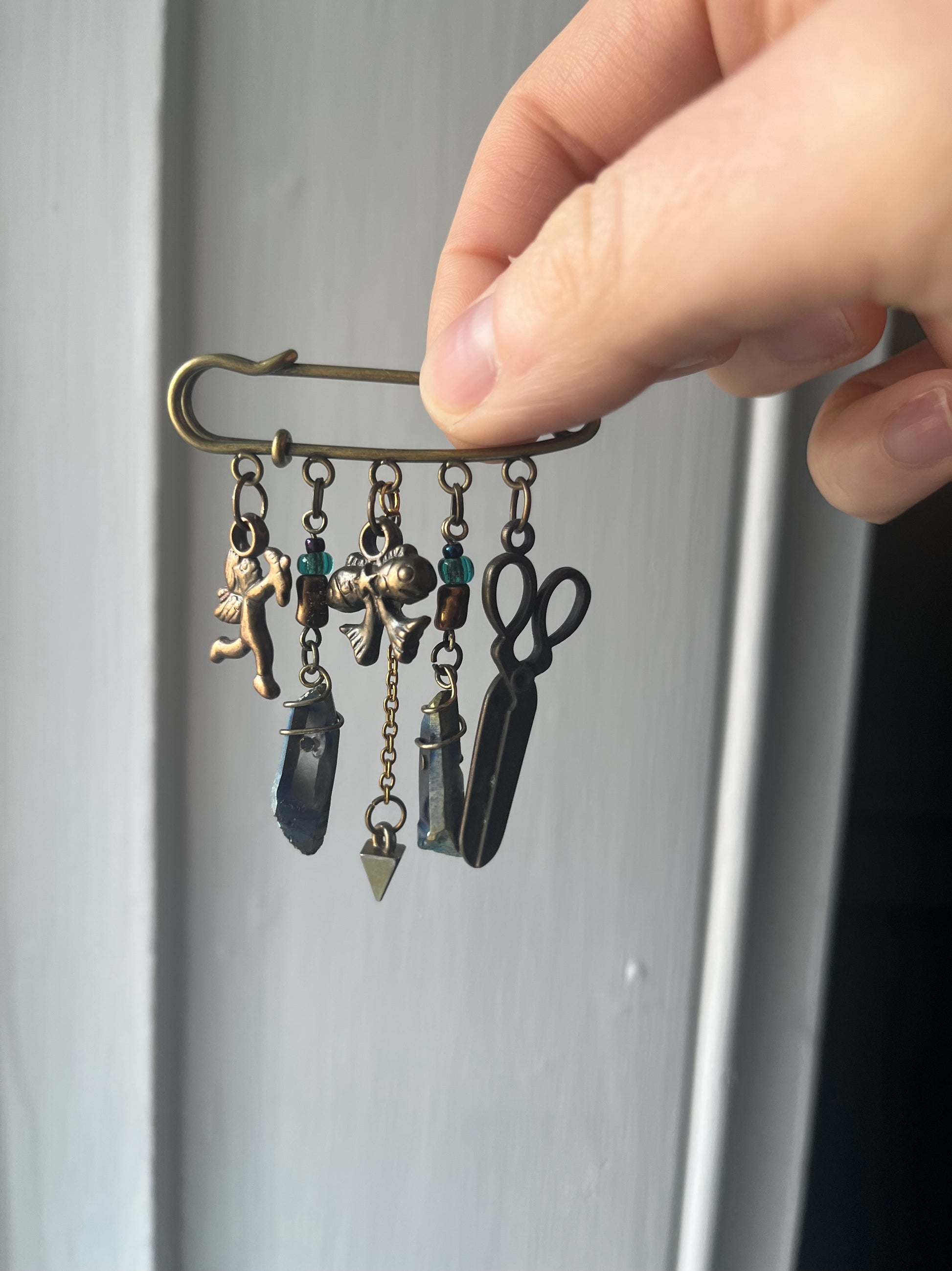 This charm pin can be worn in so many ways! On your jacket, bag, pants, hat! Get creative with your accessories! Made with repurposed beads and charms on an antique copper pin!