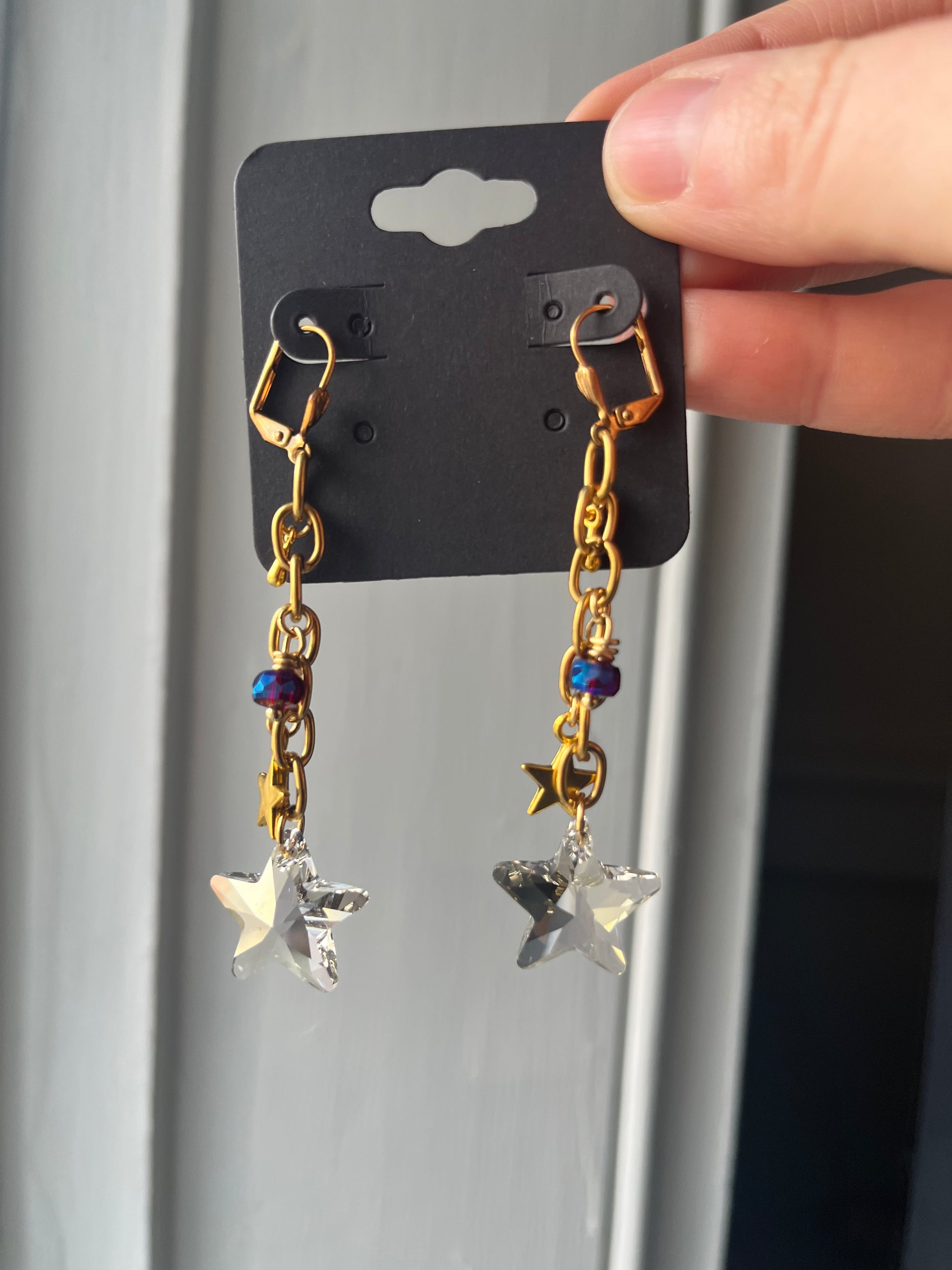 These earrings are made with stainless steel gold chain, crystal star beads and gold tone charms for a whimsical star child vibe for every occasion!