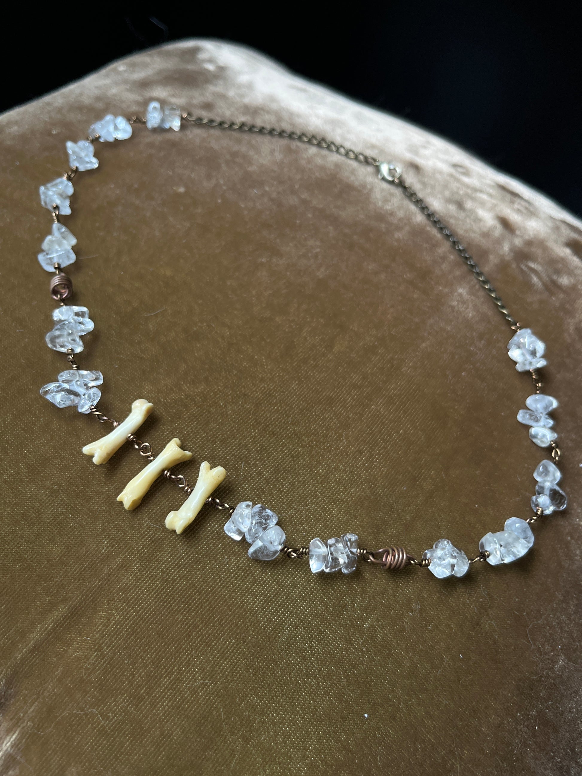 This necklace features quartz chip beads and authentic fox toe bones that were repurposed from broken earrings all strung together on antique copper wire.