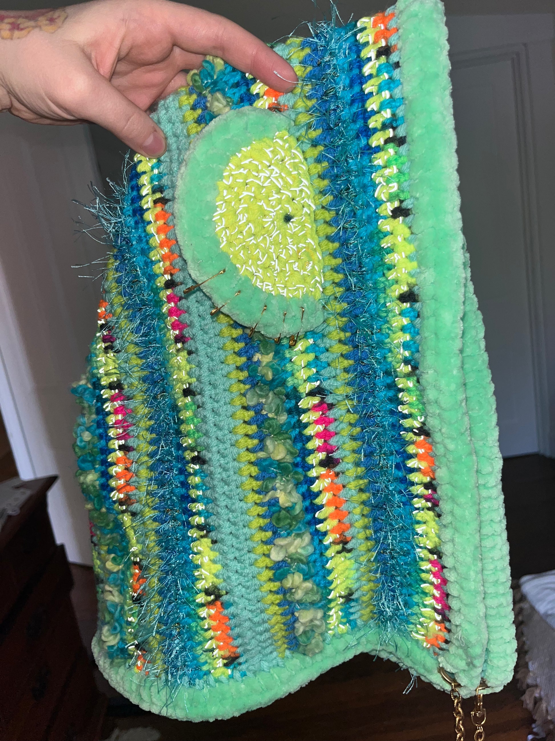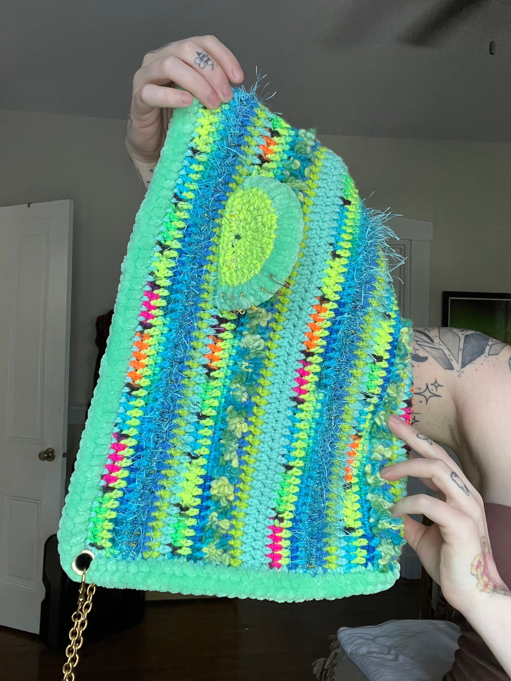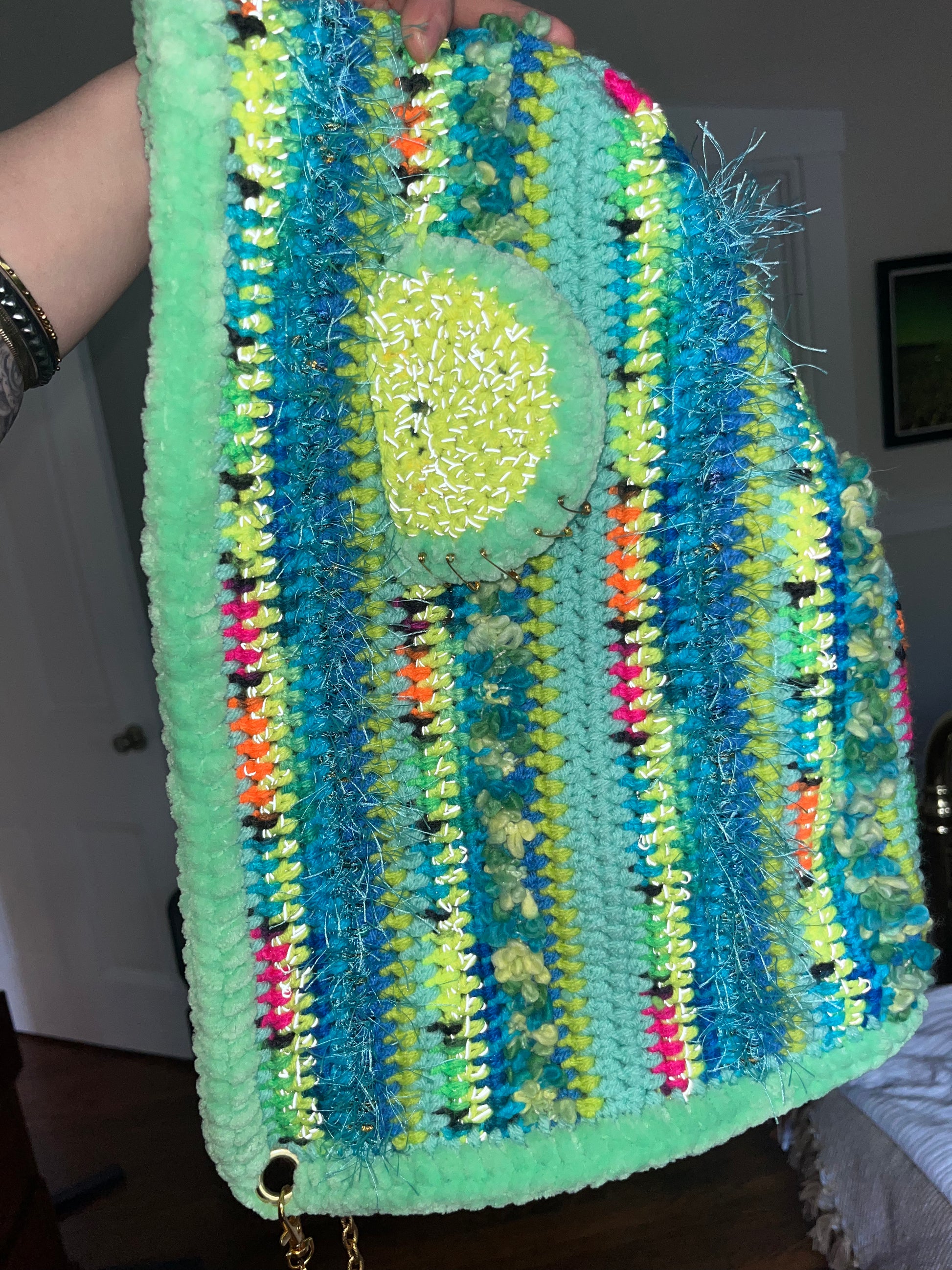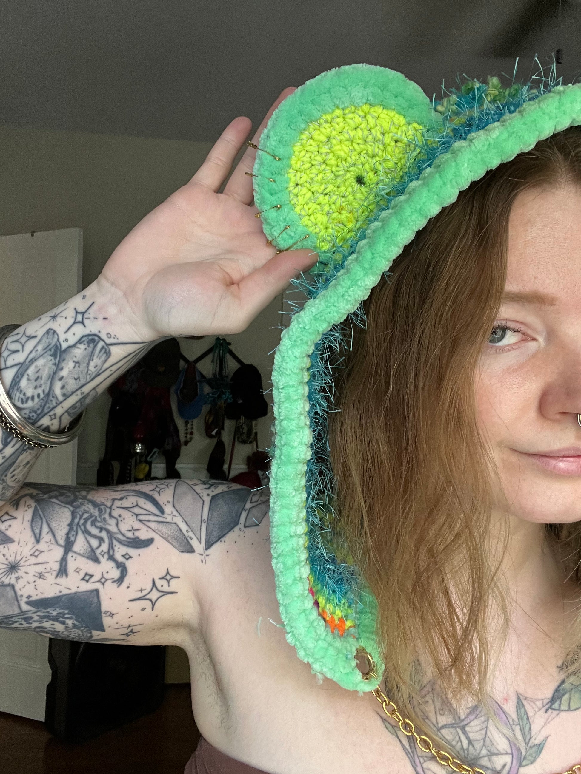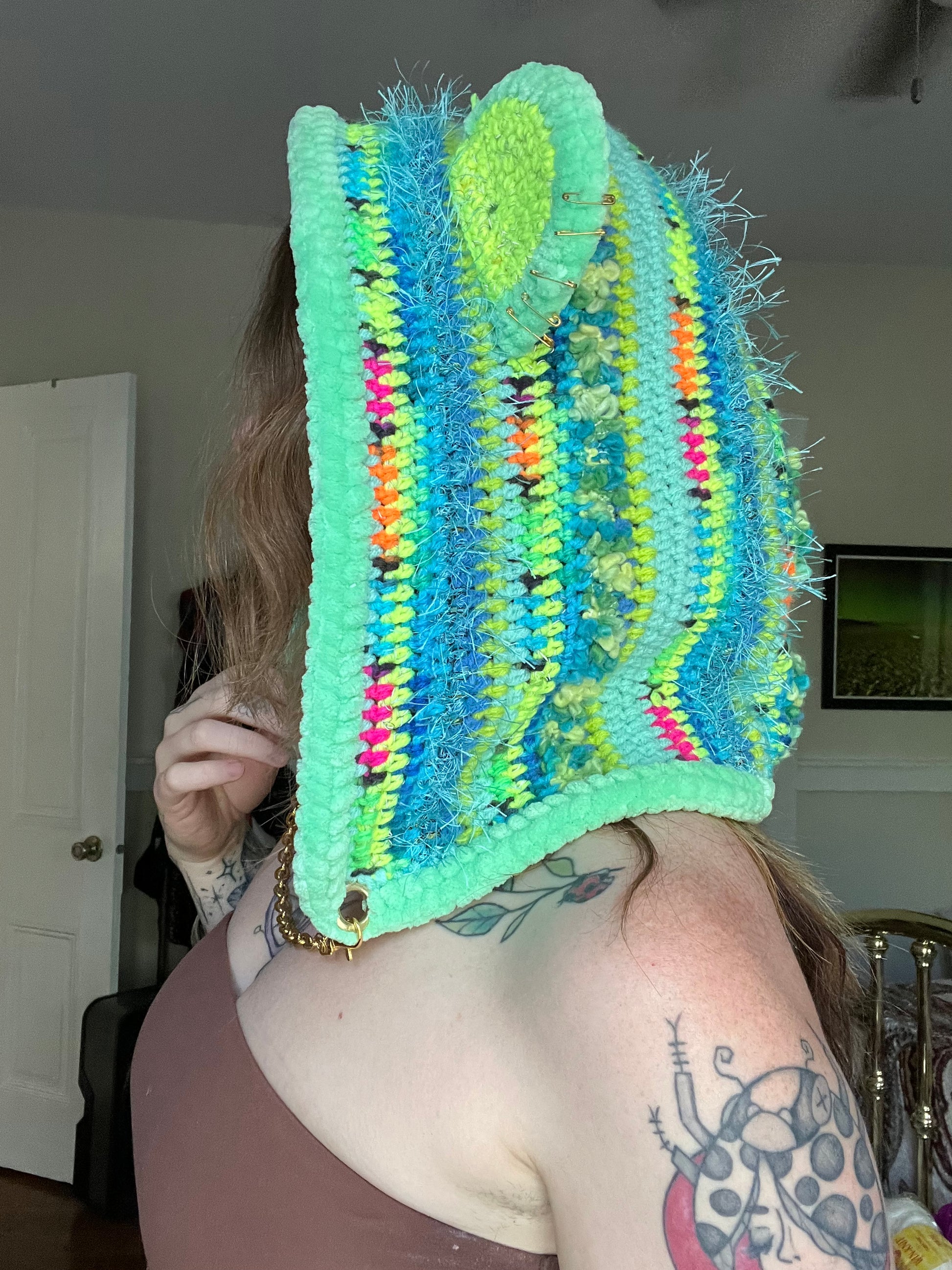 This bear hood is made with mixed texture yarns and reflective yarn in the ears and hood! Has a swivel clasp on stainless steel gold chain and gold safety pins in the ears!